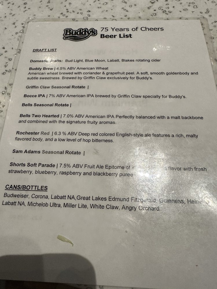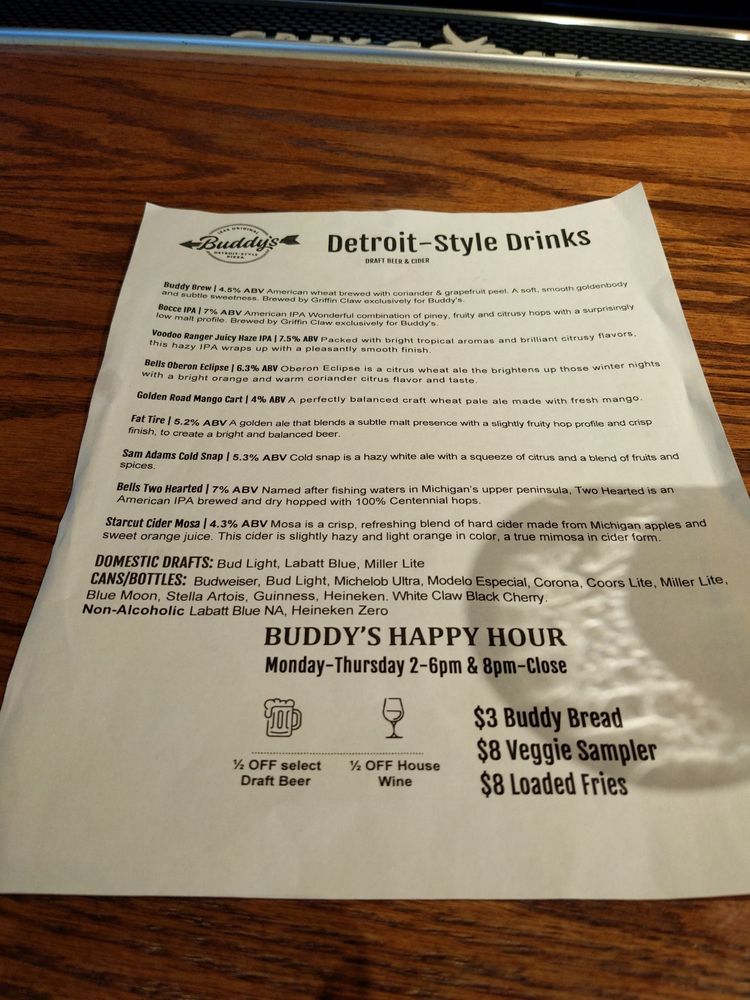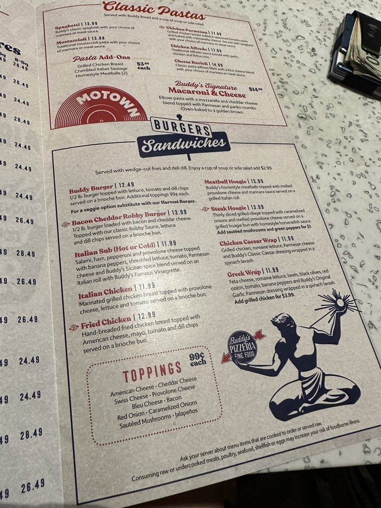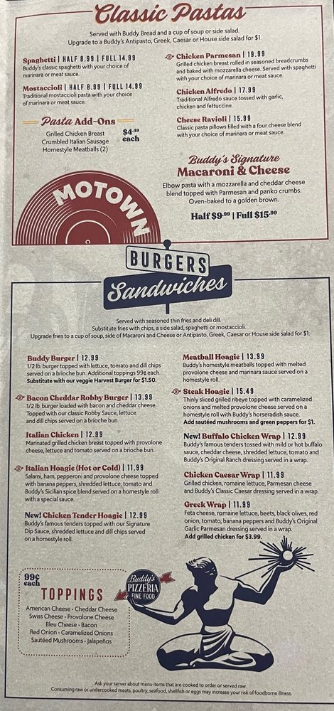 Start your meal with their Buddy Bread or Basket Fries, and don't miss the delicious lasagna, available in both traditional cheese and spinach varieties. With ample vegetarian and vegan options, Buddy's ensures there's something for everyone.